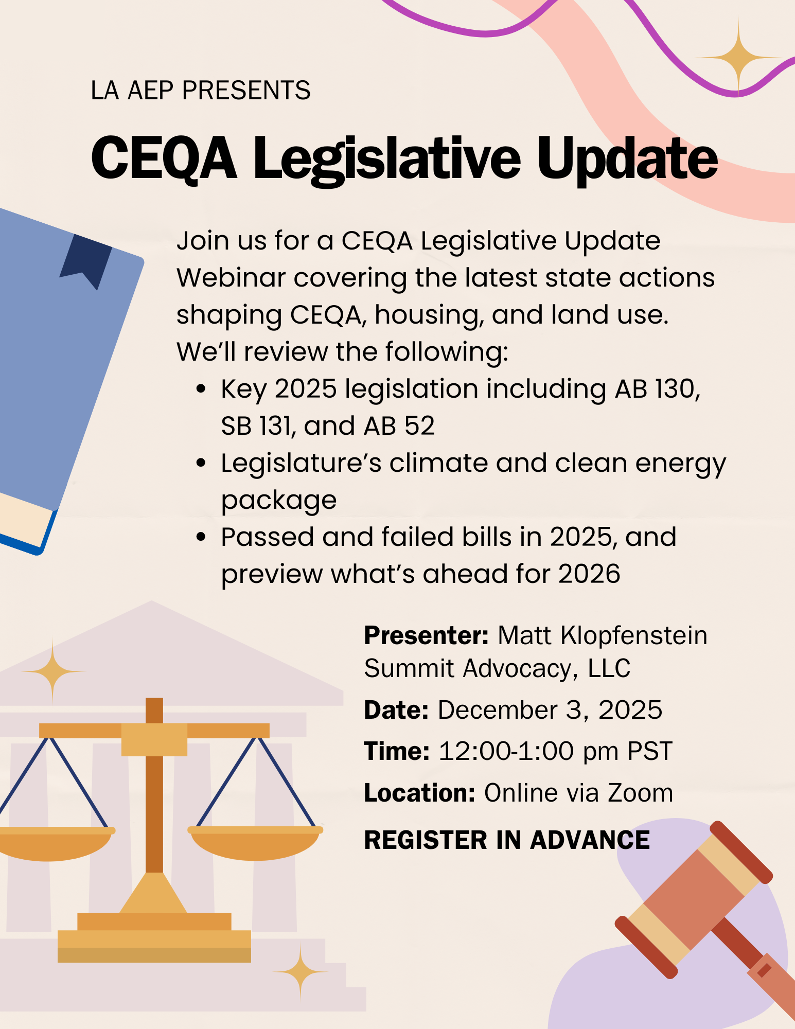 Join us for a CEQA Legislative Update from AEP's lobbyist, Matt Klopfenstein of Summit Advocacy, LLC. The presentation will give an update on state legislative activity regarding CEQA, housing and land use, including high profile items like AB 130, SB 131, and AB 52, as well as the Legislature's major package of climate and clean energy bills this year. We will examine bills that passed and failed in 2025, as well as look at what's in store for 2026.