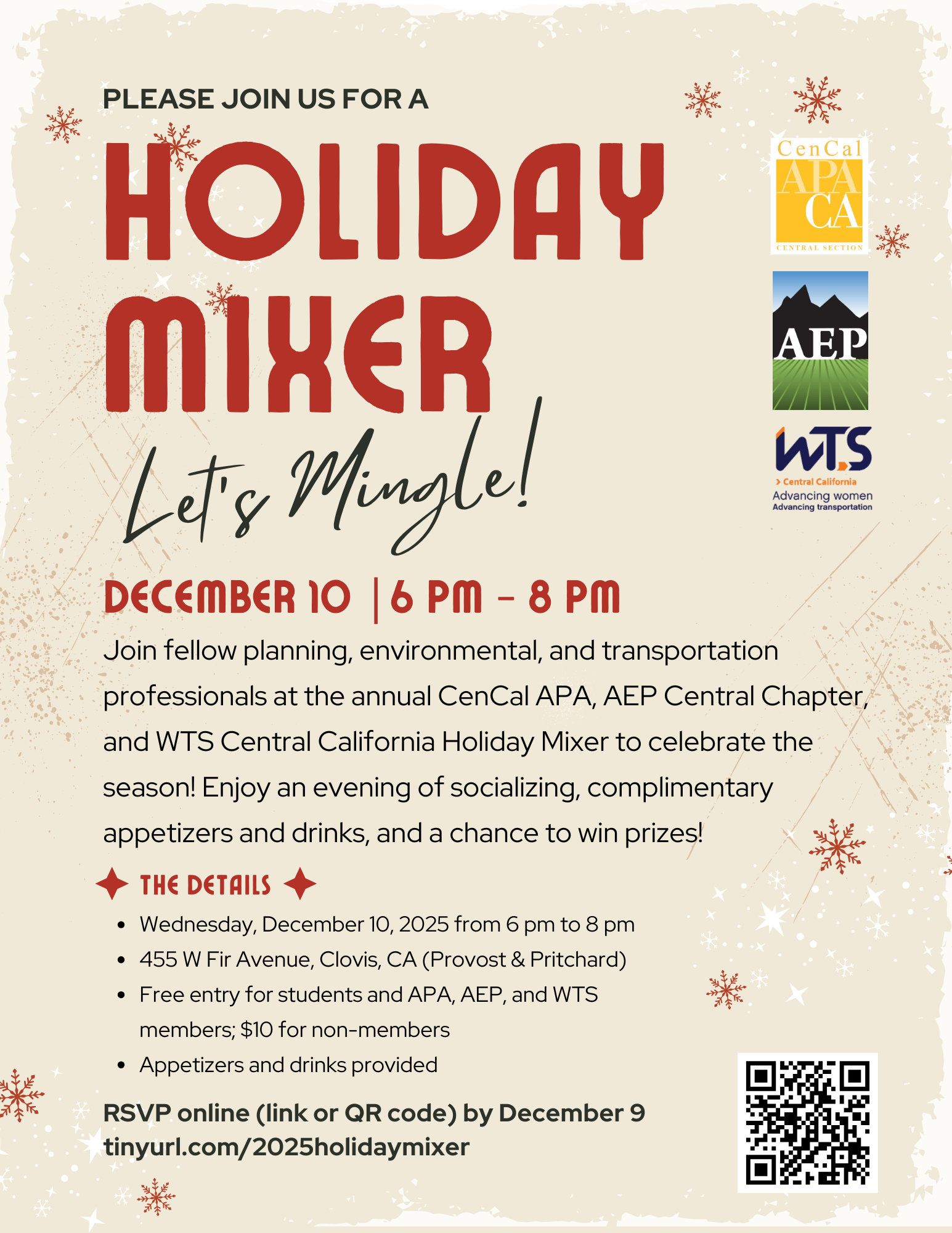 Join fellow planning, environmental, and transportation professionals at the annual CenCal APA, AEP Central Chapter, and WTS Central California Holiday Mixer to celebrate the season! Enjoy an evening of socializing, complimentary appetizers and drinks, and a chance to win prizes!