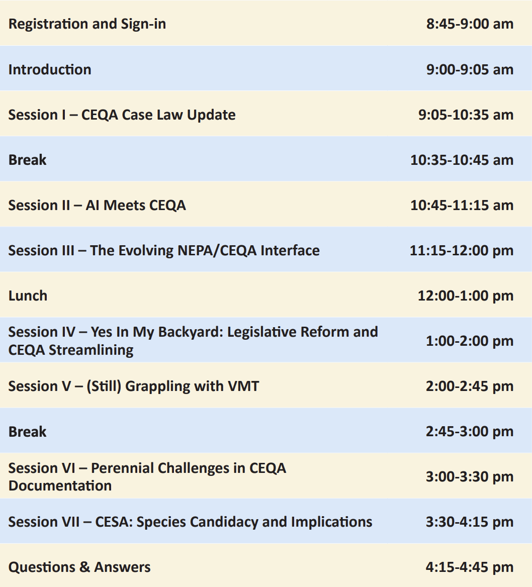 AEP is pleased to offer the 2026 Advanced CEQA Webinar, an all-day virtual workshop offered for CEQA practitioners! This workshop, a virtual version of the in-person Advanced CEQA Workshop, is designed to help consultants, regulators, applicants, and industry professionals stay current on legal trends and "hot topics" affecting the application of the Law and Guidelines.