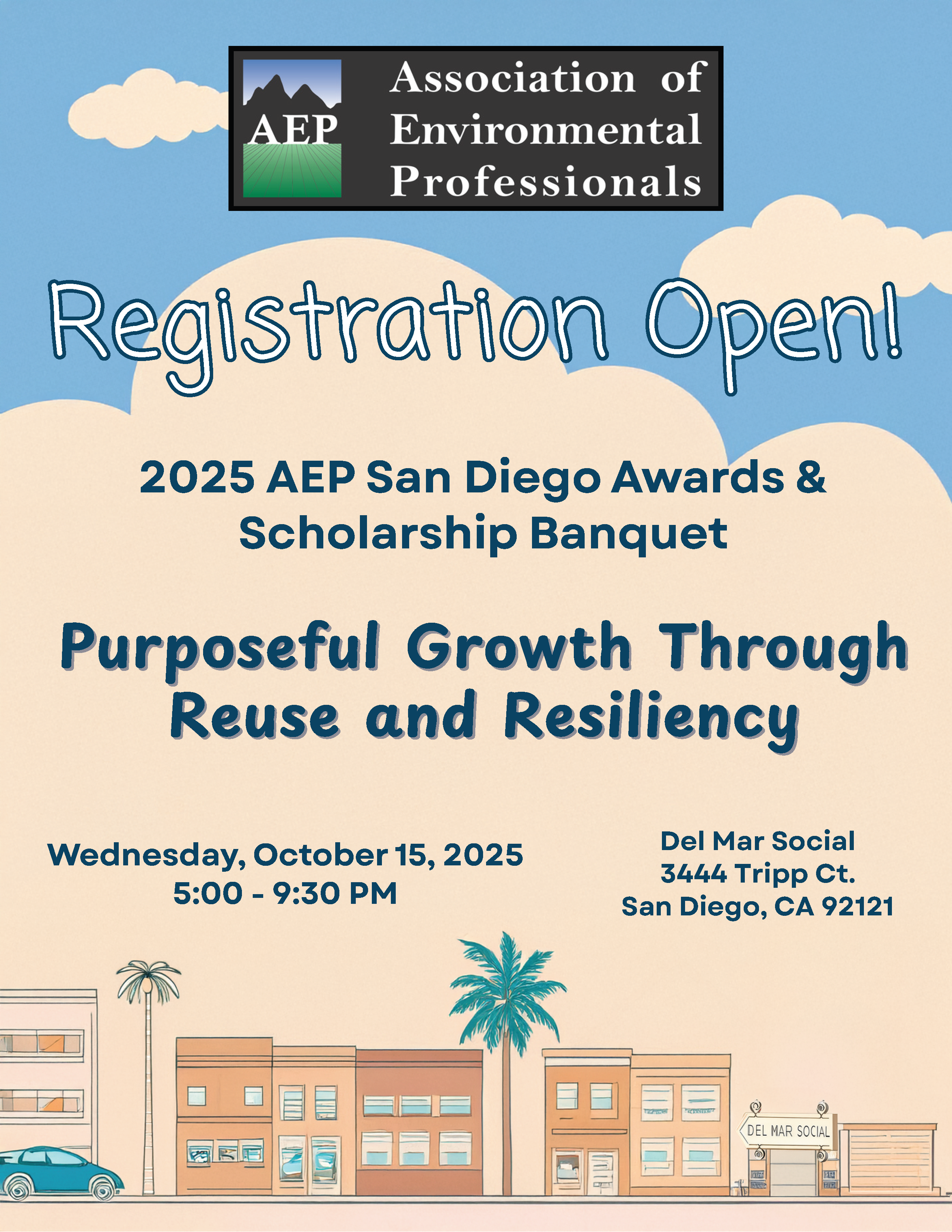 The SDAEP Awards Committee is excited to announce the 2025 Awards and Scholarship Banquet will be held in person on Wednesday, October 15th 2025 from 5-9pm. This year’s banquet will be held at Del Mar Social located at 3444 Tripp Ct Ste A2, San Diego, CA 92121.